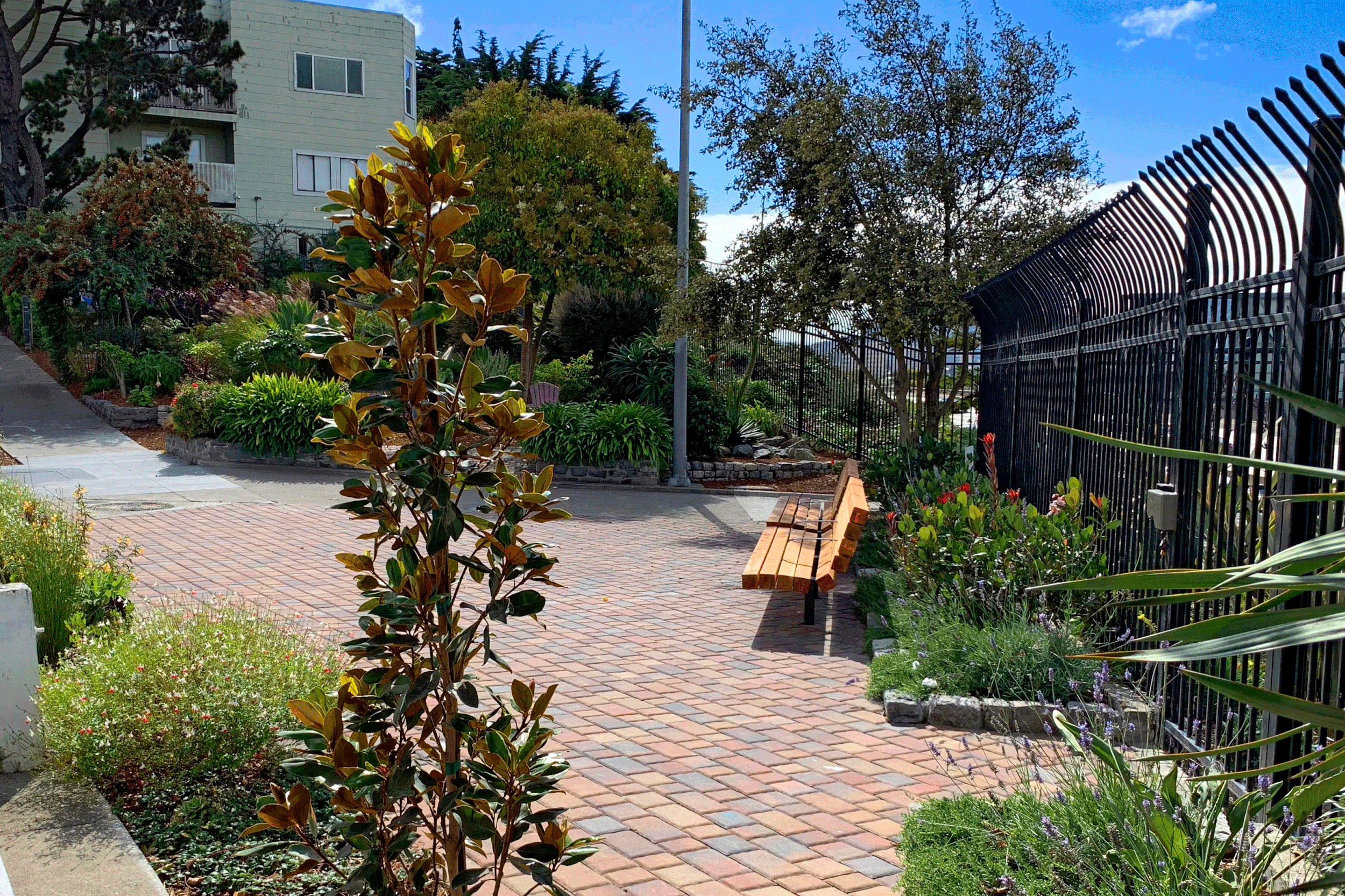 The plaza at Benches Park had not seen major upgrades since neighbors created it from Caltrans property in the 1970s. Benches and its sister park, Fallen Bridge, were created from Caltrans right of ways on either side of the 18th Street bridge over 101. The California Youth Conservation Corps helped neighbors transform the weedy dirt patch into a much-needed neighborhood amenity.